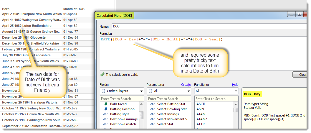 The resulting data was quite rich including dates, places etc – but the layout of the tabular data meant that I was having to pull in some raw columns of data that were in need of some complicated parsing. Now, I have a rule that I personally try to stick to as much as possible – Never Do Any Data Manipulation in Excel that can be done in Tableau – after all, why create a repetitive manual process step when you can automate it with a built-in calculation or three. Here are two examples of the raw data – and what I needed to do to convert it.