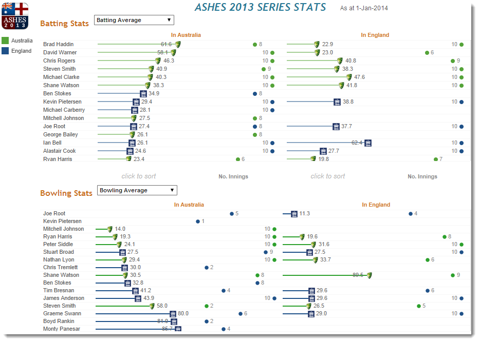 Now if you are from England or Australia, (and likely any other cricket playing nation) you pretty much know what ‘The Ashes’ are all about. – They are an institution that is centre stage in the media every 2-3 years, and have been around since 1882 (expect for a couple of pauses caused by very inconvenient world wars). For the un-initiated, The Ashes is a Best of 5 test series alternating between home and away countries with the victors winning (or retaining) The Ashes. The Ashes are housed in a tiny urn containing the ashes of a wooden bail. The full story is available at this Wikipedia page. Anyway….Australia were getting hammered by The Poms (aka The English), and I was interested in checking out the key stats of the players in each team. And what better way to do that than put together a Tableau Viz.