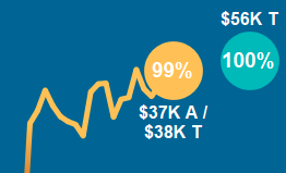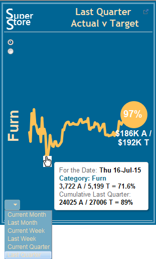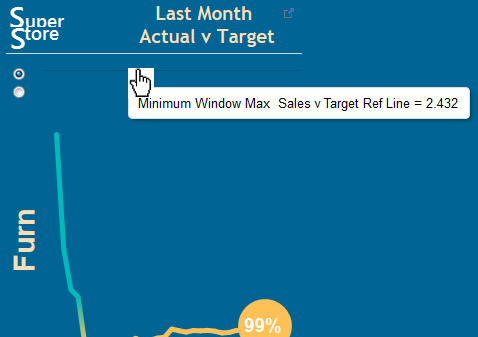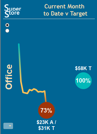 A ‘spark’ line chart with a Circle at end is a fairly simple dual axis solution, but adding that second circle for 100% month end was a bit tricky, especially as you want it to disappear when you are looking back at say the last quarter.